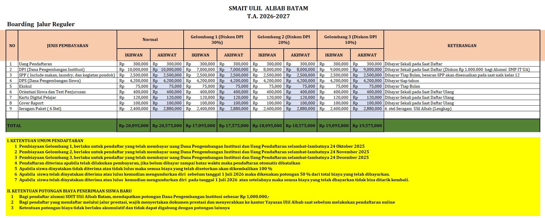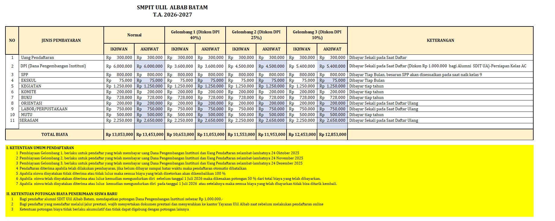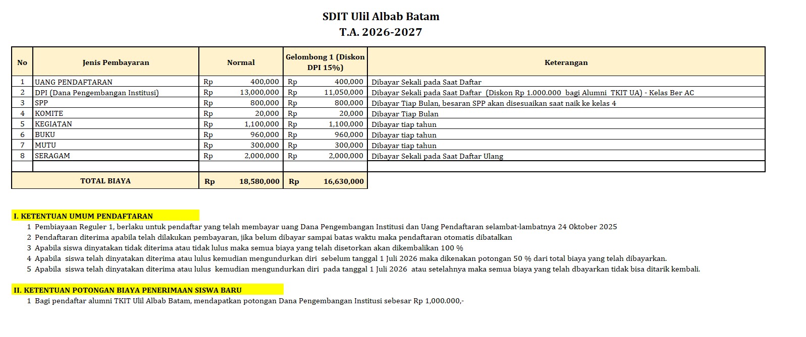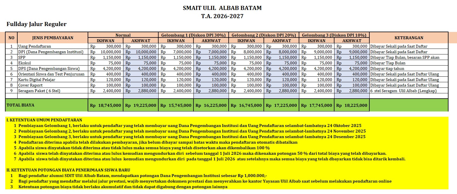 Berikut ini adalah rincian biaya PPDB Ulil Albab Batam Tahun Pelajaran 2026- 2027